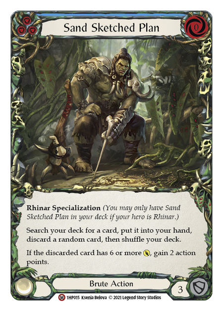 - Rhinar Specialization Search your deck for a card, put it into your hand, discard a random card, then shuffle your deck. If the discarded card has 6 or more {p}, gain 2 action points.