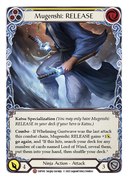 - Katsu Specialization Combo - If Whelming Gustwave was the last attack this combat chain, Mugenshi: RELEASE gains +1{p}, go again, and "If this hits, search your deck for any number of cards named Lord of Wind, reveal them, put them into your hand, then shuffle your deck."
