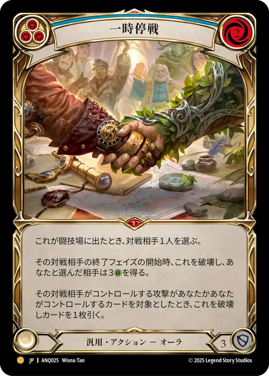 - これが闘技場に出たとき、対戦相手1人を選ぶ。{br}その対戦相手の終了フェイズの開始時、これを破壊し、あなたと選んだ相手は3{g}を得る。{br}その対戦相手がコントロールする攻撃があなたかあなたがコントロールするカードを対象としたとき、これを破壊しカードを1枚引く。