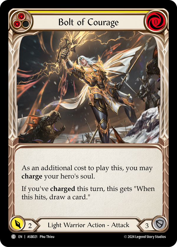 - As an additional cost to play Bolt of Courage, you may charge your hero's soul. If you've charged this turn, Bolt of Courage gains "If this hits, draw a card."