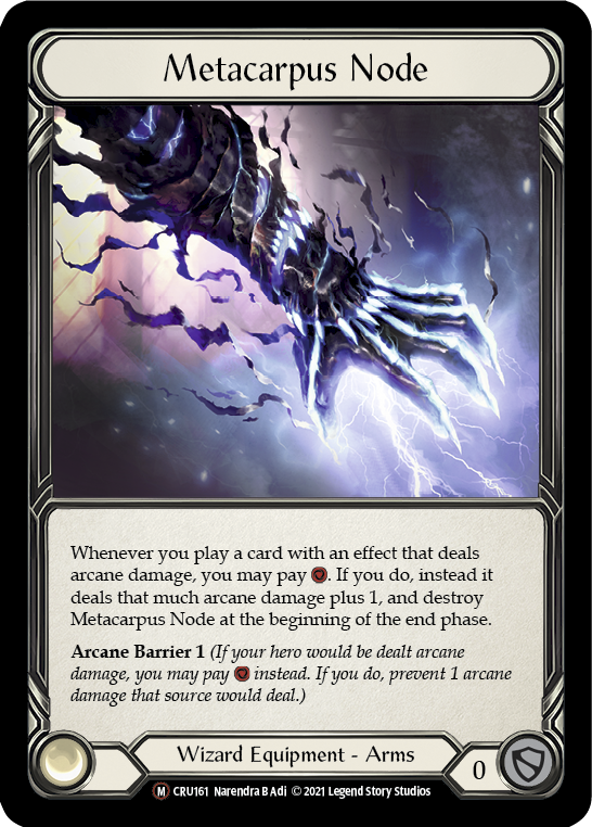 - Whenever you play a card with an effect that deals arcane damage, you may pay {r}. If you do, instead it deals that much arcane damage plus 1, and destroy Metacarpus Node at the beginning of the end phase. Arcane Barrier 1