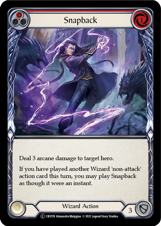 - Deal 3 arcane damage to target hero. If you have played another Wizard 'non-attack' action card this turn, you may play Snapback as though it were an instant.