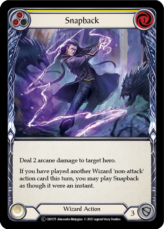 - Deal 2 arcane damage to target hero. If you have played another Wizard 'non-attack' action card this turn, you may play Snapback as though it were an instant.