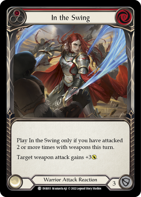 - Play In the Swing only if you have attacked 2 or more times with weapons this turn. Target weapon attack gains +3{p}.