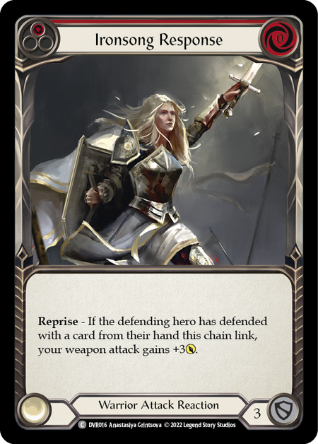 - Reprise - If the defending hero has defended with a card from their hand this chain link, target weapon attack gains +3{p}.