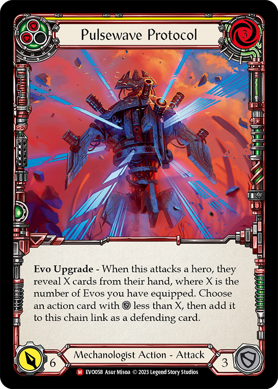- Evo Upgrade - When this attacks a hero, they reveal X cards from their hand, where X is the number of Evos you have equipped. Choose an action card with {d} less than X, then add it to this chain link as a defending card.