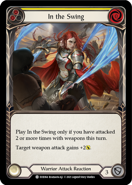 - Play In the Swing only if you have attacked 2 or more times with weapons this turn. Target weapon attack gains +2{p}.