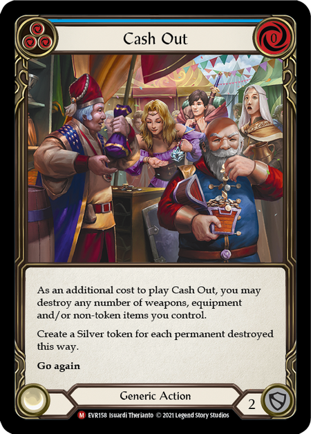 - As an additional cost to play Cash Out, you may destroy any number of weapons, equipment and/or non-token items you control. Create a Silver token for each permanent destroyed this way. Go again