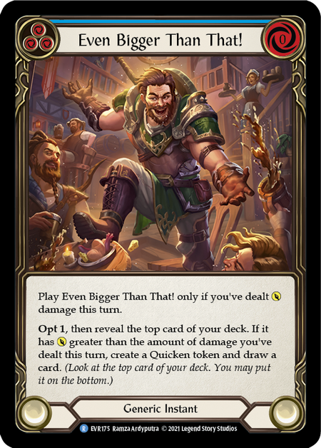 - Play Even Bigger Than That! only if you've dealt {p} this turn. Opt 1, then reveal the top card of your deck. If it has {p} greater than the amount of damage you've dealt this turn, create a Quicken token and draw a card.