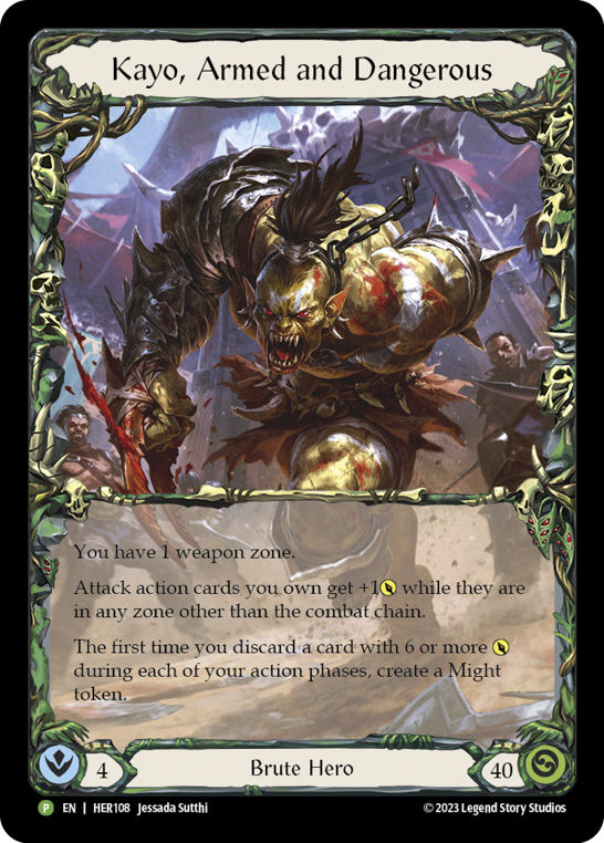 - You have 1 weapon zone. Attack action cards you own get +1{p} while they are in any zone other than the combat chain. The first time you discard a card with 6 or more {p} during each of your action phases, create a Might token.