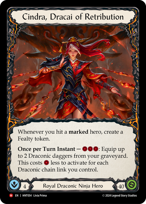- Whenever you hit a marked hero, create a Fealty token. Once per Turn Instant - {r}{r}{r}: Equip up to 2 Draconic daggers from your graveyard. This costs {r} less to activate for each Draconic chain link you control.