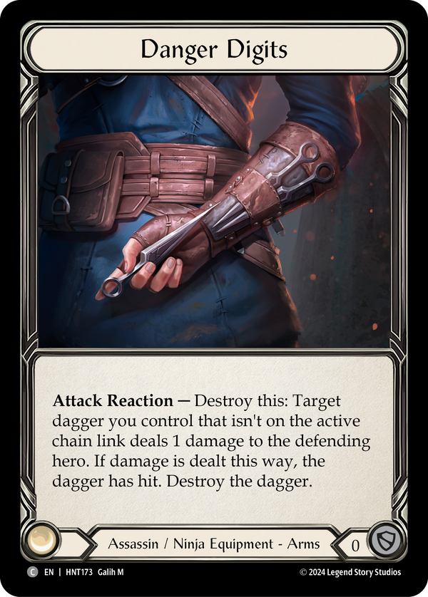 - Attack Reaction - Destroy this: Target dagger you control that isn't on the active chain link deals 1 damage to the defending hero. If damage is dealt this way, the dagger has hit. Destroy the dagger.