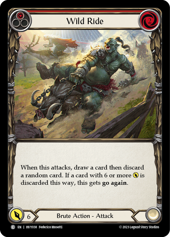 - When you attack with Wild Ride, draw a card then discard a random card. If a card with 6 or more {p} is discarded this way, Wild Ride gains go again.