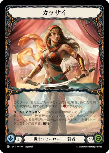 - If you've drawn a card this turn, your sword attacks cost {r} less to activate. Once per Turn Action - Banish 2 red and 2 yellow cards from your graveyard: The next time a weapon you control hits a hero this turn, create a Gold token. Go again