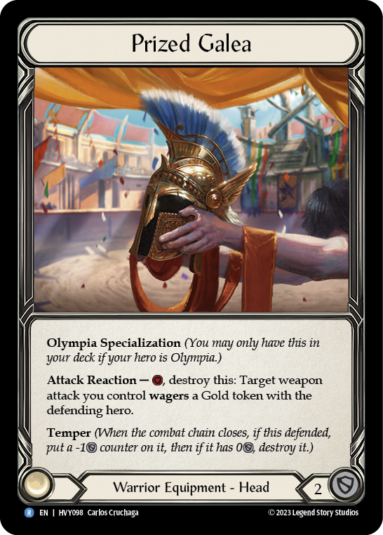 - Olympia Specialization Attack Reaction - {r}, destroy this: Target weapon attack you control wagers a Gold token with the defending hero. Temper