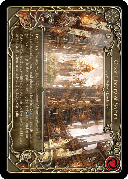 - Legendary At the beginning of each end phase, if a hero has 2 or more cards with yellow color strips in their pitch zone, they gain +1{i} until end of turn. Action - Discard 2 cards with yellow color strips: Destroy Great Library of Solana. Any hero may activate this ability. Go again