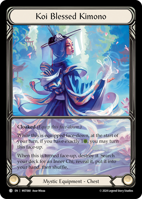 - Cloaked While this is equipped face-down, at the start of your turn, if you have exactly 1{h}, you may turn this face-up. When this is turned face-up, destroy it. Search your deck for an Inner Chi, reveal it, put it into your hand, then shuffle.
