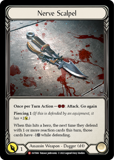 - Once per Turn Action - {r}{r}: Attack. Go again Piercing 1 When this hits a hero, the next time they defend with 1 or more reaction cards this turn, those cards have -1{d} while defending.