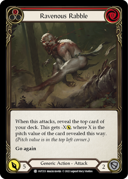 - When this attacks, reveal the top card of your deck. This gets -X{p}, where X is the pitch value of the card revealed this way. Go again