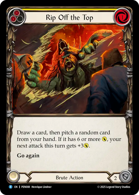 - Draw a card, then pitch a random card from your hand. If it has 6 or more {p}, your next attack this turn gets +3{p}.{br}**Go again**