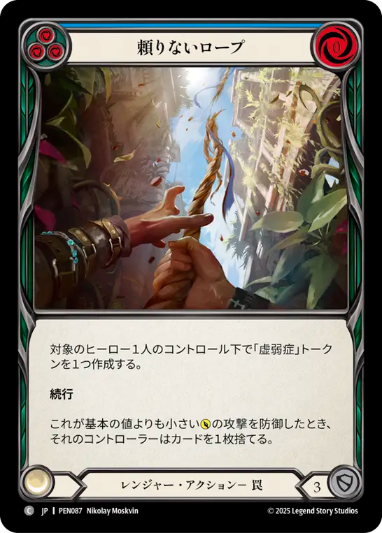 - 対象のヒーロー1人のコントロール下で「虚弱症」トークンを1つ作成する。{br}**続行**{br}これが基本の値よりも小さい{p}の攻撃を防御したとき、それのコントローラーはカードを1枚捨てる。