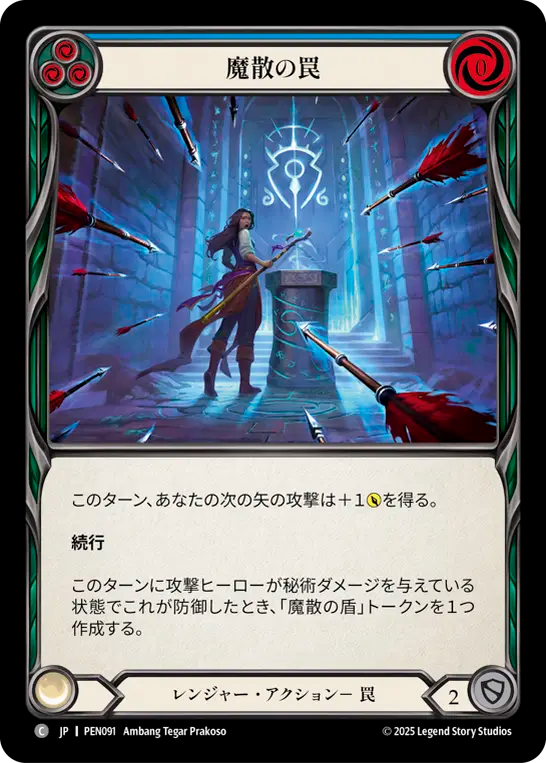- このターン、あなたの次の矢の攻撃は+1{p}を得る。{br}**続行**{br}このターンに攻撃ヒーローが秘術ダメージを与えている状態でこれが防御したとき、「魔散の盾」トークンを1つ作成する。