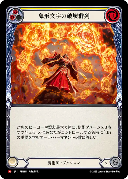 - 対象のヒーローや盟友最大X体に、秘術ダメージを3点ずつ与える。Xはあなたがコントロールする名前に「印」の単語を含むオーラ・パーマネントの数に等しい。