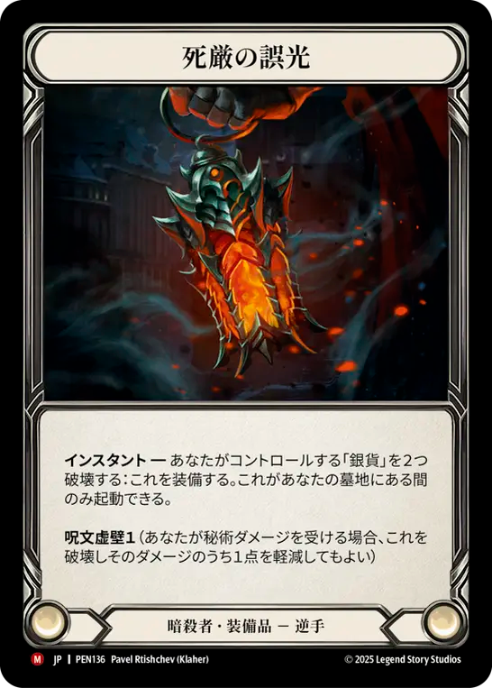 - **インスタント**--あなたがコントロールする「銀貨」を2つ破壊する:これを装備する。これがあなたの墓地にある間のみ起動できる。{br}**呪文虚壁1**(あなたが秘術ダメージを受ける場合、これを破壊しそのダメージのうち1点を軽減してもよい)