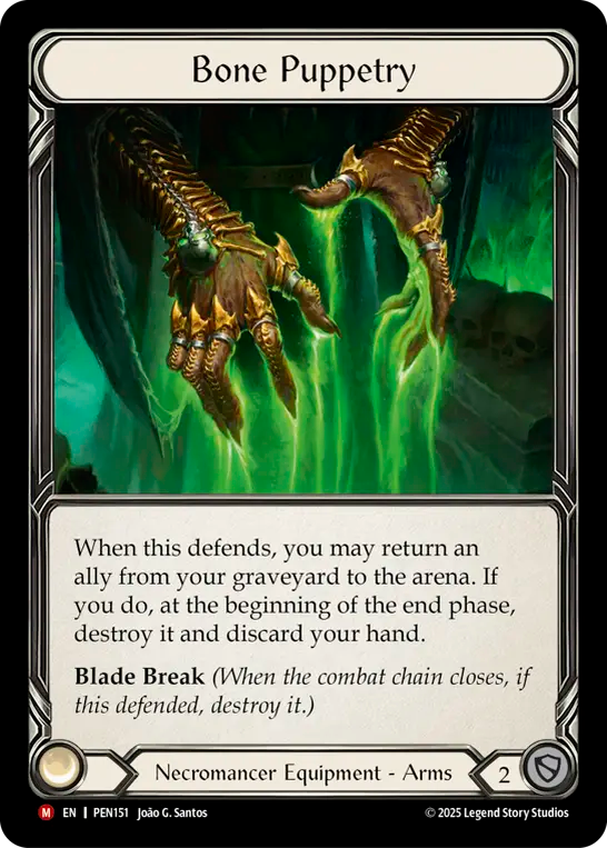 - When this defends, you may return an ally from your graveyard to the arena. If you do, at the beginning of the end phase, destroy it and discard your hand.{br}**Blade Break** _(When the combat chain closes, if this defended, destroy it.)_