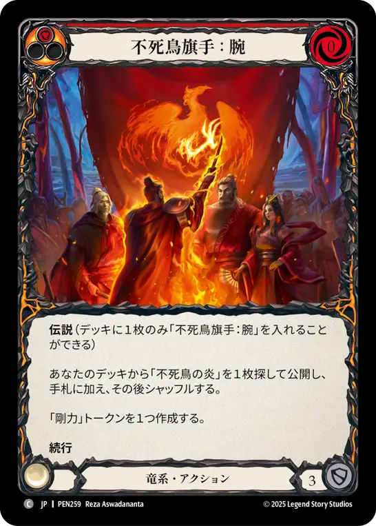 - **伝説**(デッキに1枚のみ「不死鳥旗手:腕」を入れることができる){br}あなたのデッキから「不死鳥の炎」を1枚探して公開し、手札に加え、その後シャッフルする。{br}「剛力」トークンを1つ作成する。{br}**続行**
