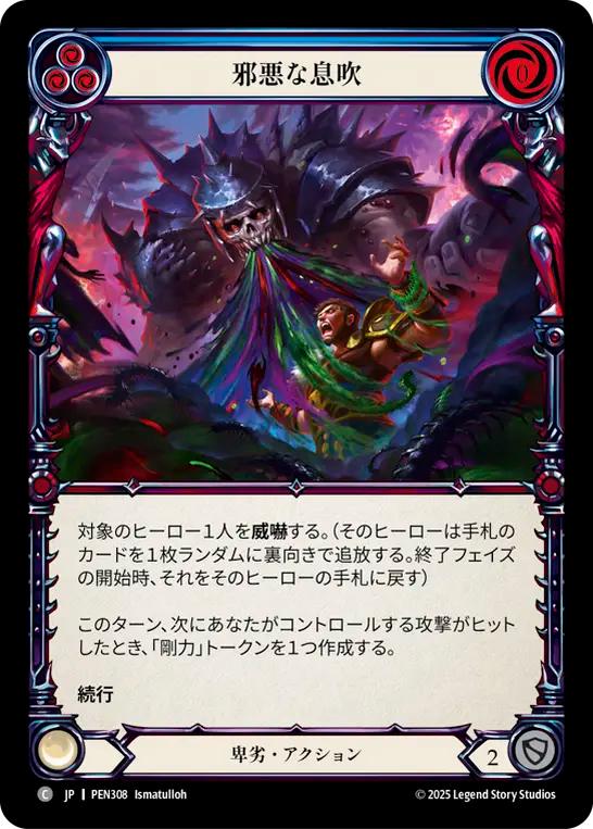 - 対象のヒーロー1人を**威嚇**する。(そのヒーローは手札のカードを1枚ランダムに裏向きで追放する。終了フェイズの開始時、それをそのヒーローの手札に戻す){br}このターン、次にあなたがコントロールする攻撃がヒットしたとき、「剛力」トークンを1つ作成する。{br}**続行**