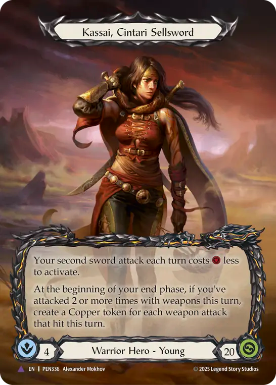 - Your second sword attack each turn costs {r} less to activate.{br}At the beginning of your end phase, if you've attacked 2 or more times with weapons this turn, create a Copper token for each weapon attack that hit this turn.