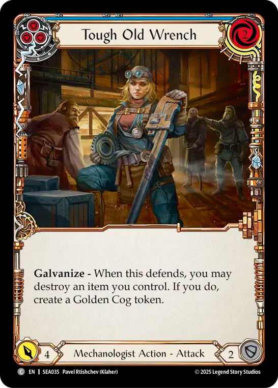 - Galvanize - When this defends, you may destroy an item you control. If you do, create a Golden Cog token.