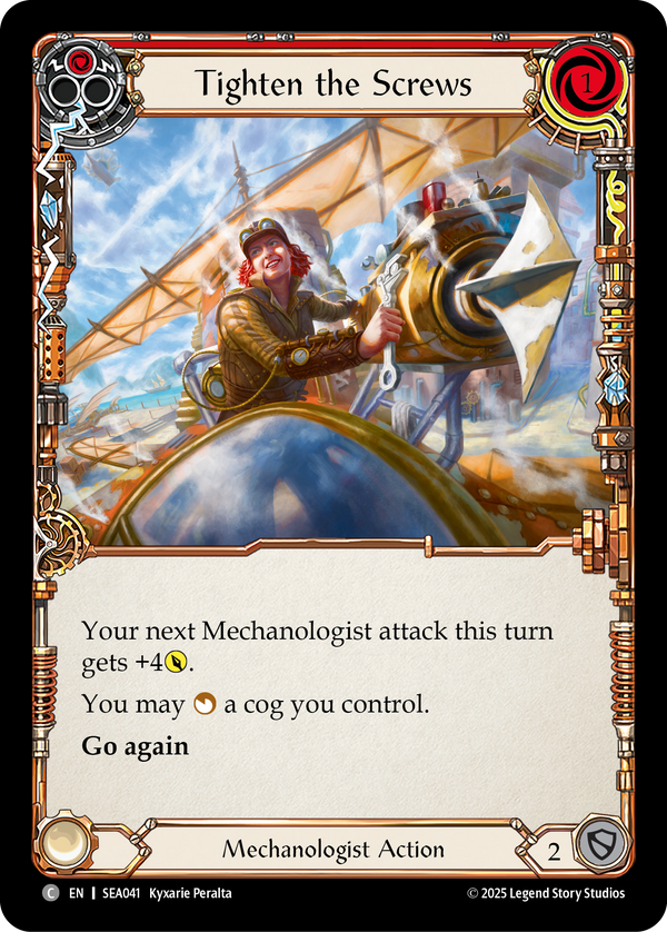 - Your next Mechanologist attack this turn gets +4{p}. You may {u} a cog you control. Go again