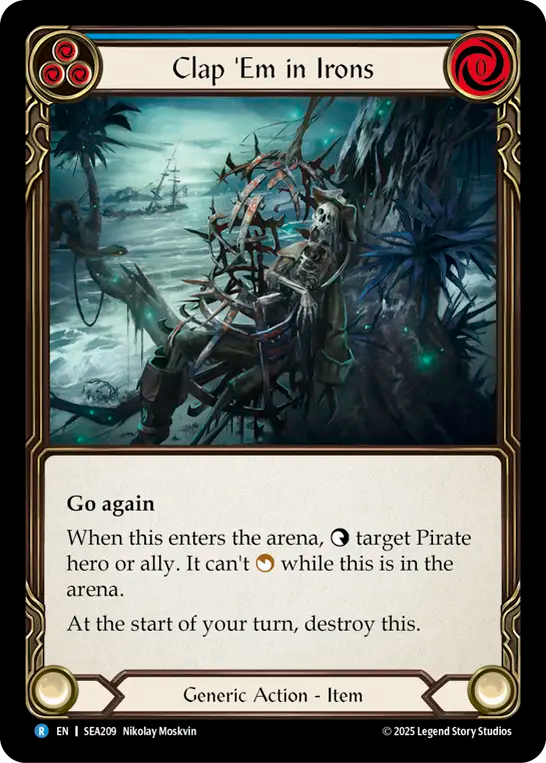 - Go again When this enters the arena, {t} target Pirate hero or ally. It can't {u} while this is in the arena. At the start of your turn, destroy this.