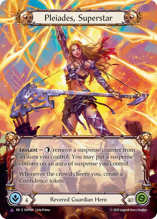- Instant - {t}, remove a suspense counter from an aura you control: You may put a suspense counter on an aura of suspense you control. Whenever the crowd cheers you, create a Confidence token.