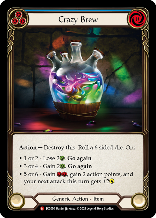 - Action - Destroy this: Roll a 6 sided die. On; 1 or 2 - Lose 2{h}. Go again 3 or 4 - Gain 2{h}. Go again 5 or 6 - Gain {r}{r}, gain 2 action points, and your next attack this turn gains +2{p}.