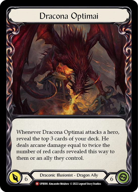 - Whenever Dracona Optimai attacks a hero, reveal the top 3 cards of your deck. He deals arcane damage equal to twice the number of red cards revealed this way to them or an ally they control.
