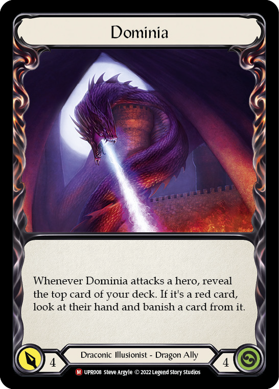 - Whenever Dominia attacks a hero, reveal the top card of your deck. If it's a red card, look at their hand and banish a card from it.